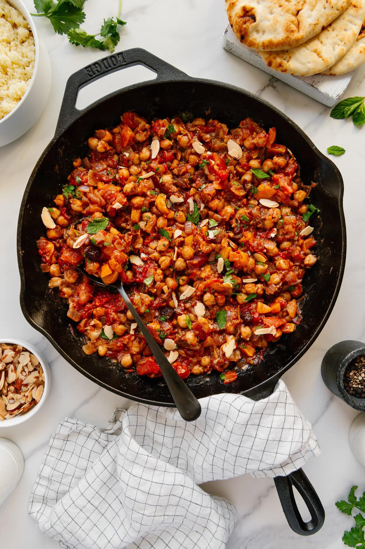 This one-skillet Moroccan chickpea recipe is slightly spicy, slightly sweet and very savory. Simple pantry ingredients come together to create this warm, aromatic and cozy dish. Every bite is so satisfying and best of all it is super quick and easy to make.