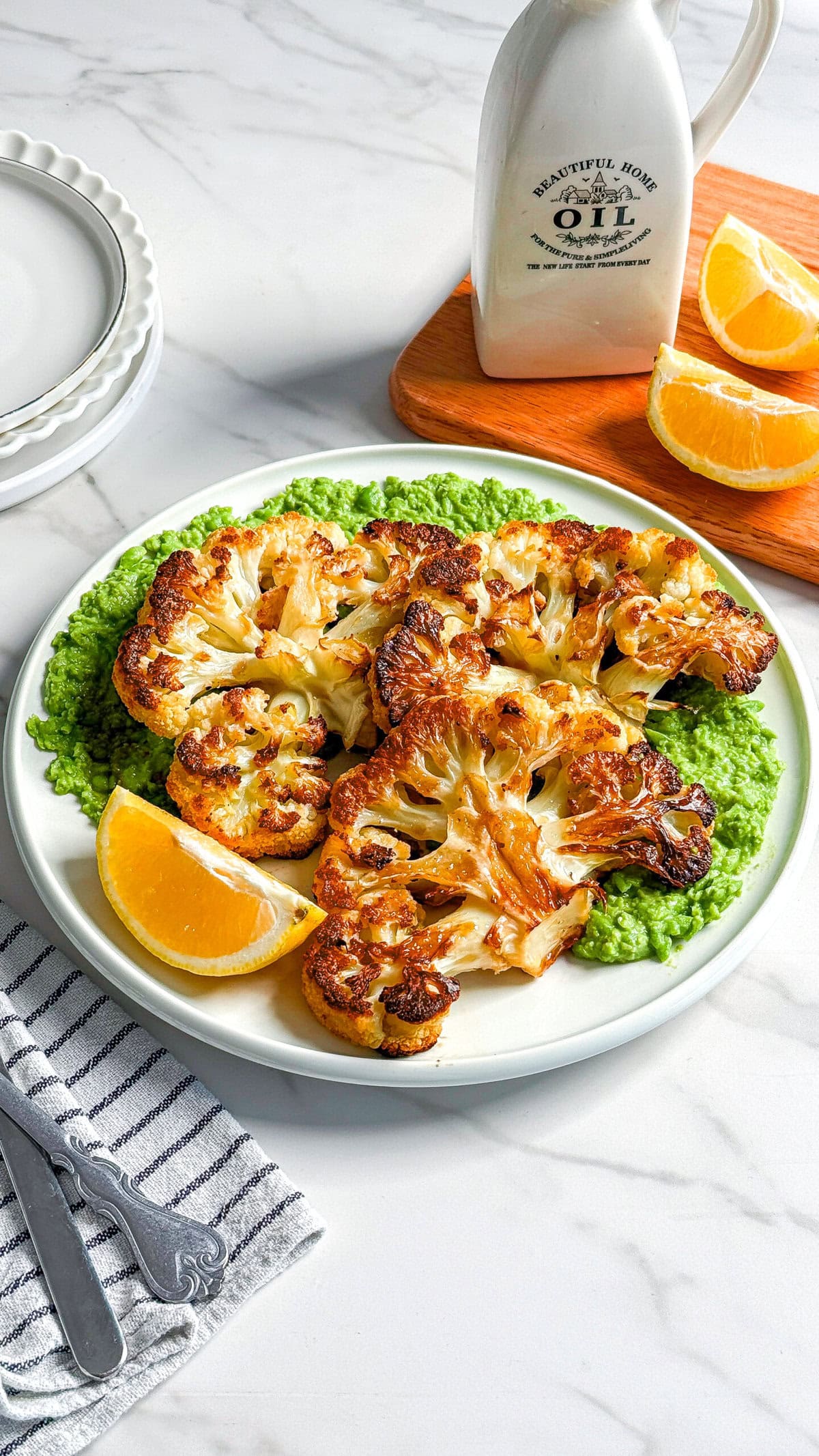 Roasted Cauliflower Steaks with Lemony Mashed Peas and Mint
