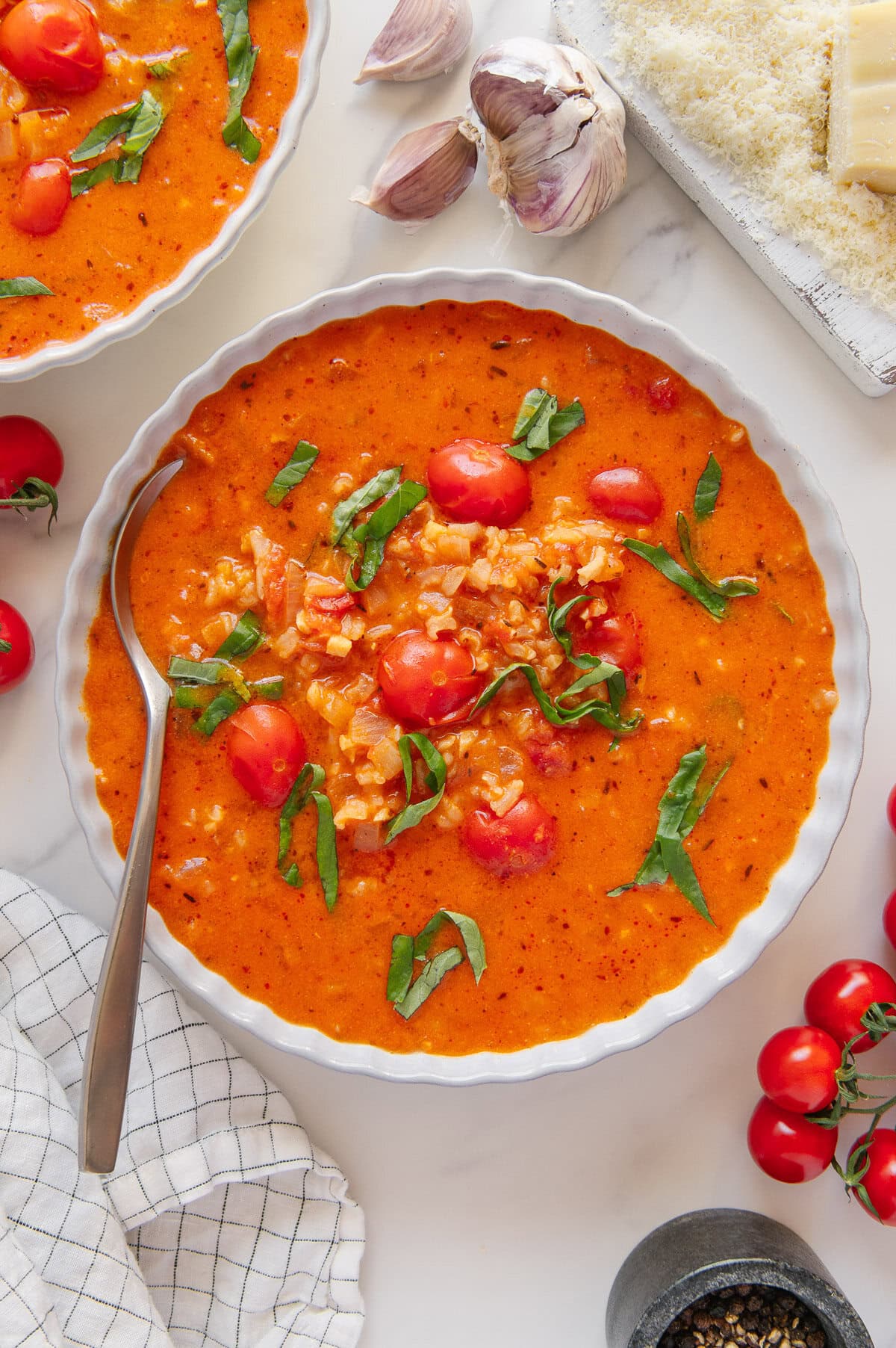 Another key difference is the addition of the rice. It cooks right in the soup, absorbing the tomato broth while releasing starch that naturally thickens the soup. The texture becomes thick, hearty and almost risotto-like. It also adds fiber, bulk and substance, making the soup far more filling than a traidtional tomato soup!